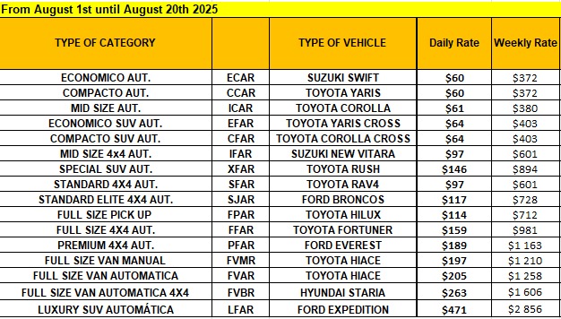 Alamo Car Rental Rates include : basic insurance TPI and CDW, taxes, non drop of fees and 2 drivers, possible to add Racks for extra U$7 and child seats U$7